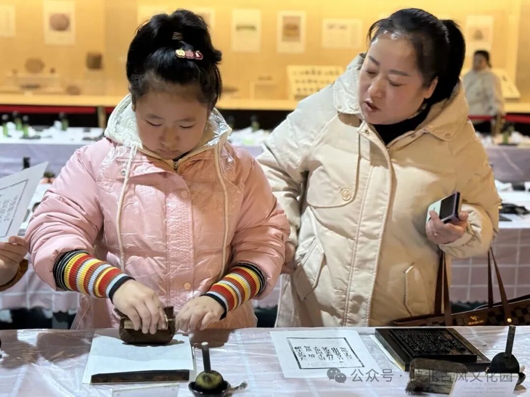 在活字印刷环节,孩子们用拓包将油墨刷在木活字上,铺上宣纸,用手轻轻按压,再用刷子轻轻拓印,确保不遗落任何一个字。随后,他们小心翼翼地揭起宣纸,一首古诗便跃然纸上。