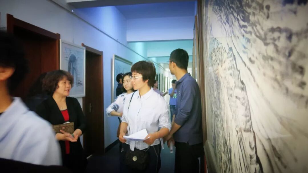 单榆生董事长向调研组介绍集团楼内五层走廊里陈列着书画、刺绣、剪纸等作品的来源和内容。