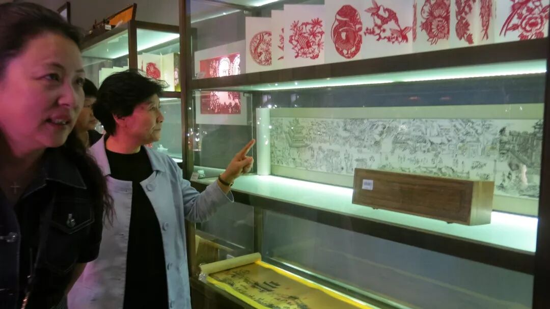 视察组参观朔方文创展厅内的文创作品,对民间纯手工刺绣、剪纸文创产品、六楼骑街图等精美作品细细观摩,并给予了较高的评价。