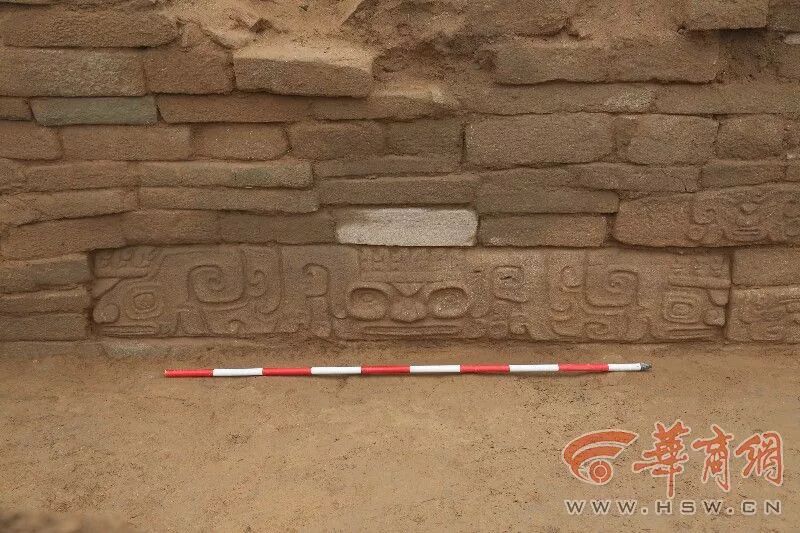 据悉,本年度(2018年)发现的三十余件石雕作品集中出土于大台基南护墙墙体的倒塌石块内,有一些还镶嵌在南护墙墙面上。这些石雕绝大多数为雕刻于石块一面的单面雕刻,以减地浮雕为主,雕刻内容可分为符号、人面、神面、动物、神兽等,有一些画面长度近3米,以中心正脸的神面为中心,两侧对称雕出动物和侧脸人面,体现出成熟的艺术构思和精湛的雕刻技艺。